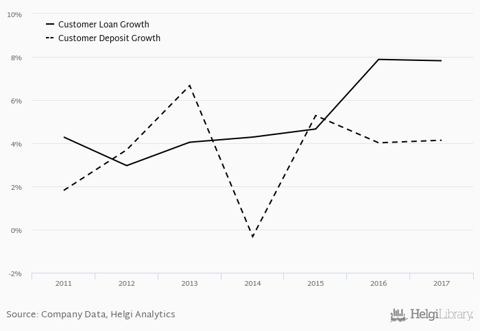 On the other hand, bank's customer deposit growth amounted to 4.14% at the end of 2017, up from 4.02% when compared to the previous year. Historically, the bank’s deposit growth reached an all time high of 6.67% in 2013 and an all time low of -0.323% in 2014. In the last decade, the average annual loan growth amounted to 0%.