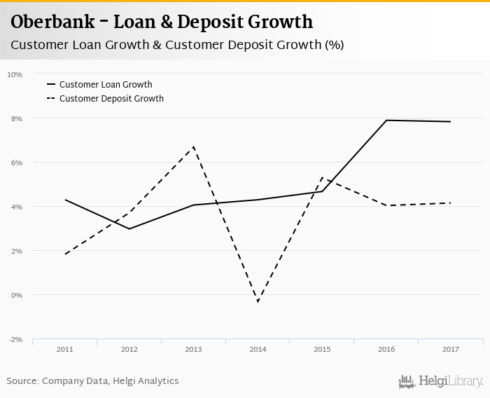 Oberbank's customer loan growth reached 7.82% in 2017, down from 7.88% compared to the previous year. Historically, the bank’s loans growth reached an all time high of 7.88% in 2016 and an all time low of 2.96% in 2012. In the last decade, the average annual loan growth amounted to 0%.