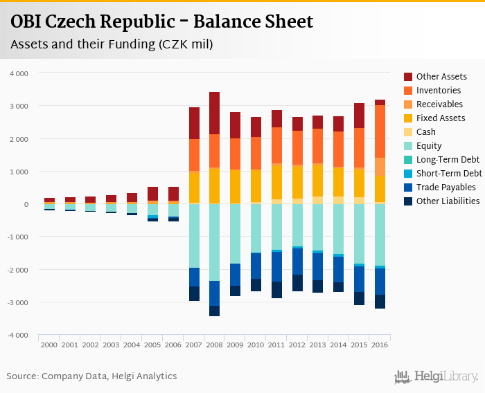 OBI Czech Republic's total assets reached CZK 3,193 mil at the end of 2016, up 3.51% compared to the previous year.
