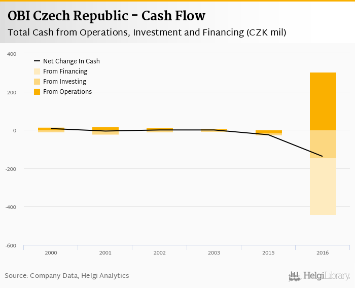 OBI Czech Republic's operating cash flow stood at CZK 302 mil in 2016, up 2% when compared to the previous year. Historically, between 2000 - 2016, the firm’s operating cash flow reached a high of CZK 302 mil in 2016 and a low of CZK -15.4 mil in 2015.