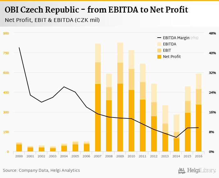 As far as OBI Czech Republic's peers are concerned, Hornbach Baumarkt Czech Republic posted net and EBITDA margin of 5.34% and 9.21%, respectively in 2016, Mountfield generated margins of 2.04% and 6.98% and Baumax Czech Republic profit margin reached -2.07% on the net and 0.039% on the EBITDA level in 2019.