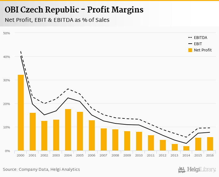 OBI Czech Republic made a net profit of CZK 358 mil with revenues of CZK 6,170 mil in 2016, up by 21.6% and up by 17.8%, respectively, compared to the previous year.