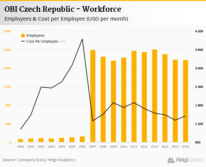 OBI Czech Republic employed 1,777 employees in 2016, down 0.504% compared to the previous year. Historically, between 2000 and 2016, the firm's workforce hit a high of 2,004 employees in 2013 and a low of 69.0 employees in 2000.