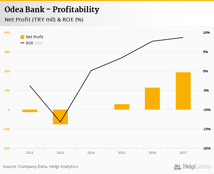 Odea Bank made a net profit of TRY 310 mil in 2017, up 69.5% compared to the previous year. This implies a return on equity of 8.62%.