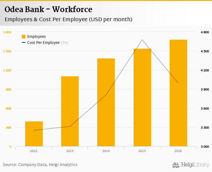 Odea Bank employed 1,681 persons in 2016, up 9.30% when compared to the previous year. Historically, the bank's workforce hit an all time high of 1,681 persons in 2016 and an all time low of 396 in 2012.