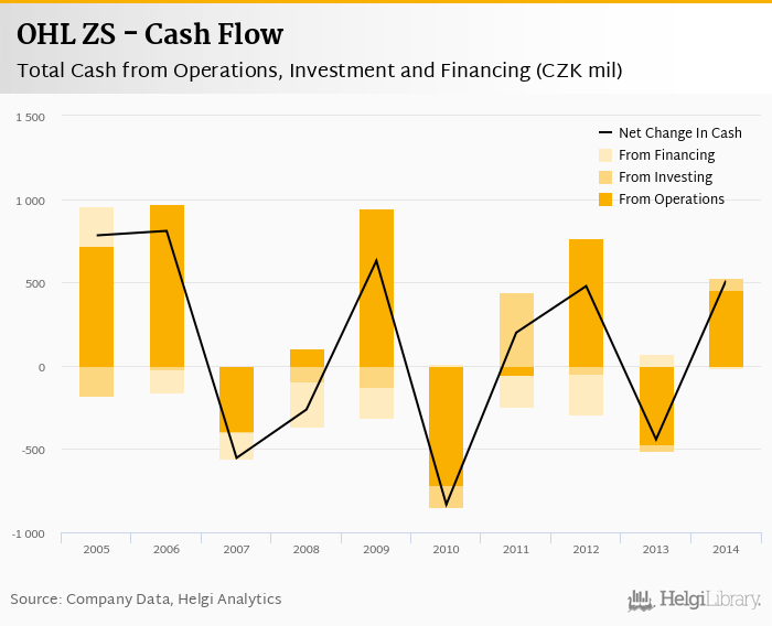 OHL ZS's operating cash flow stood at CZK 458 mil in 2014, up 198% when compared to the previous year. Historically, between 2005 - 2014, the firm’s operating cash flow reached a high of CZK 968 mil in 2006 and a low of CZK -716 mil in 2010.