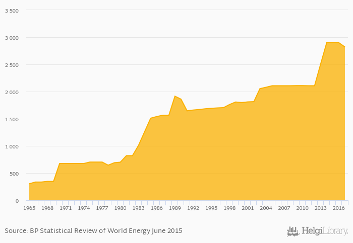 Historically, oil refinery capacities in Saudi Arabia reached an all time high of 2,899 '000 barrels daily in 2016 and an all time low of 303 '000 barrels daily in 1965.