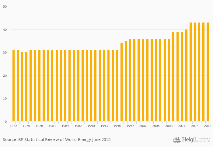 Oil refinery capacities rose 0% to 43.0 '000 barrels daily in Bangladesh in 2017, according to the BP Statistical Review of World Energy.