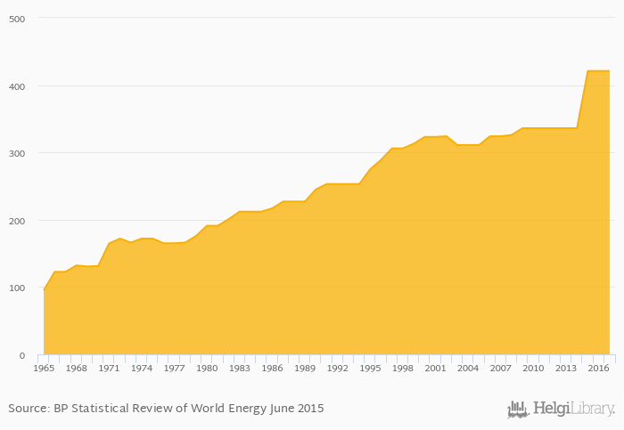 Oil refinery capacities rose 0% to 421 '000 barrels daily in Colombia in 2017, according to the BP Statistical Review of World Energy.