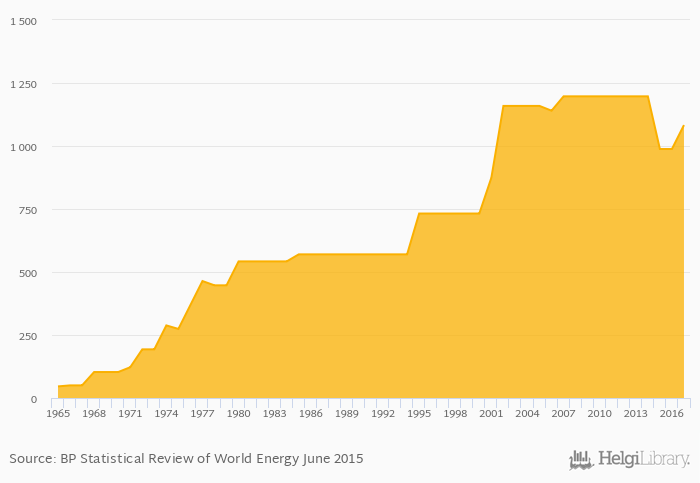 Oil refinery capacities rose 9.62% to 1,083 '000 barrels daily in Taiwan in 2017, according to the BP Statistical Review of World Energy.