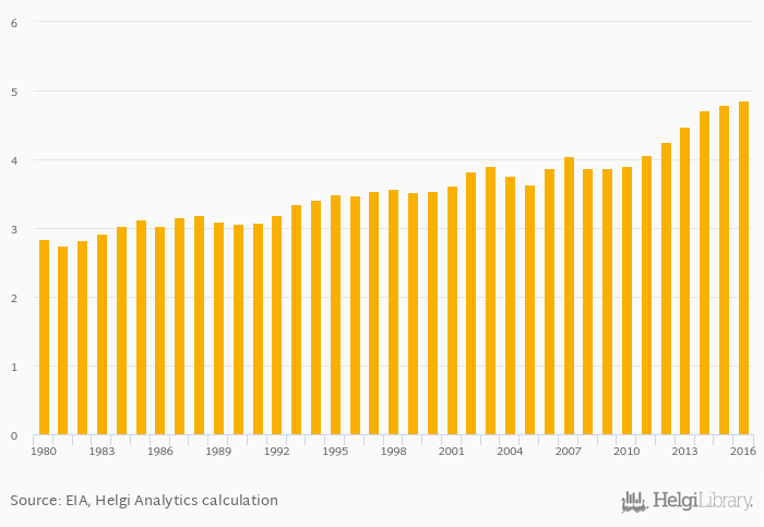 Oil supply as a share of worldwide supply rose 1.39% to 4.85% in Canada in 2016, according to EIA.