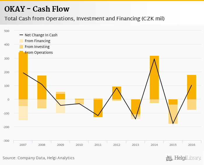 OKAY's operating cash flow stood at CZK 178 mil in 2016, up 562% when compared to the previous year. Historically, between 2007 - 2016, the firm’s operating cash flow reached a high of CZK 343 mil in 2007 and a low of CZK -129 mil in 2011.