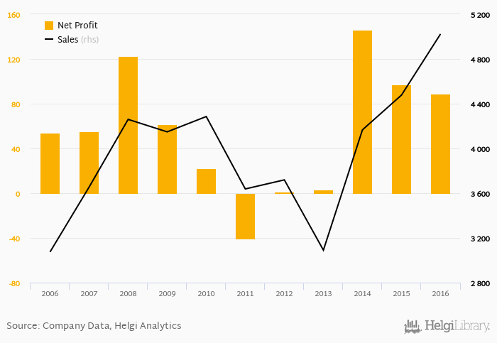 Sales have grown by 5.03% a year on average since 2006. They reached a high of CZK 5,023 mil in 2016 and a low of CZK 3,075 mil in 2006.