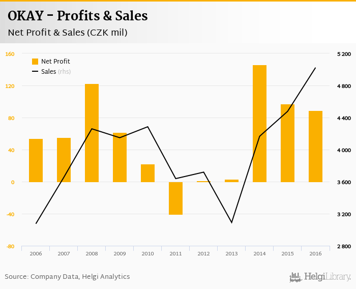 OKAY made a net profit of CZK 88.7 mil in 2016, down 8.95% compared to the previous year. Total sales reached CZK 5,023 mil, which is up 12.2% when compared to the previous year.