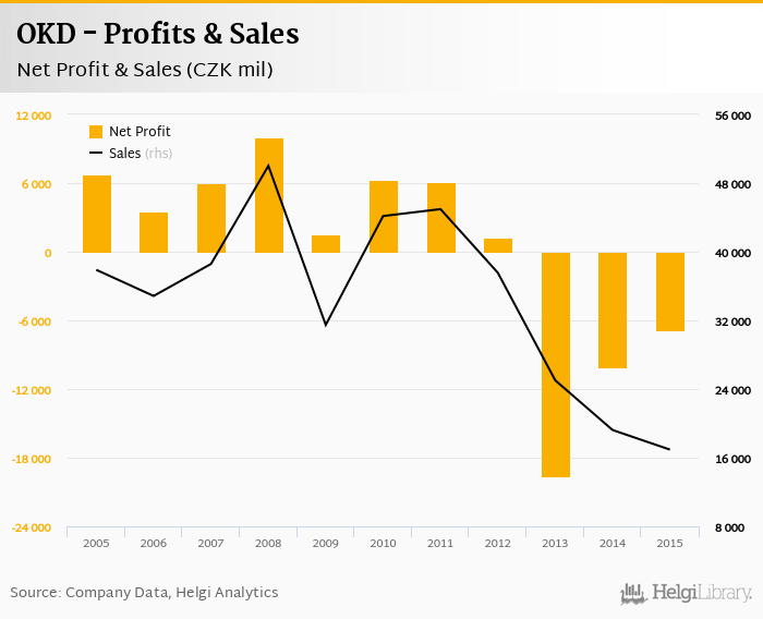 OKD made a net profit of CZK -6,828 mil in 2015, up 32.4% compared to the previous year. Total sales reached CZK 16,941 mil, which is down 11.9% when compared to the previous year.