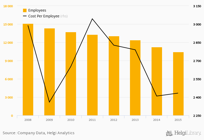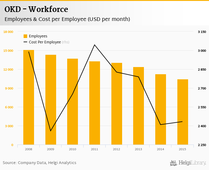 OKD employed 10,423 employees in 2015, down 7.38% compared to the previous year. Historically, between 2008 and 2015, the firm's workforce hit a high of 15,090 employees in 2008 and a low of 10,423 employees in 2015.