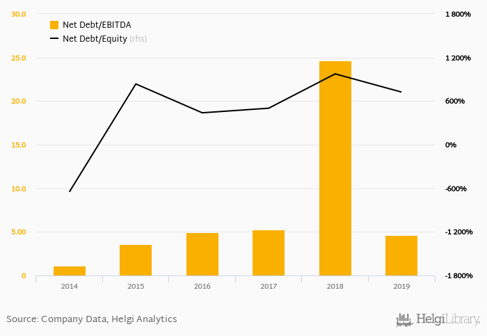 Historically, the firm’s net debt to equity reached a high of 975% in 2018 and a low of -650% in 2014 between 2014 and 2019. The average for the last five years was 695%.