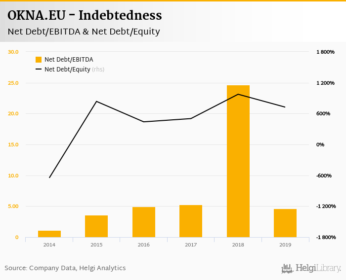 OKNA.EU's net debt stood at CZK 55.6 mil and accounted for 724% of equity at the end of 2019. The ratio is down 251 pp compared to the previous year.