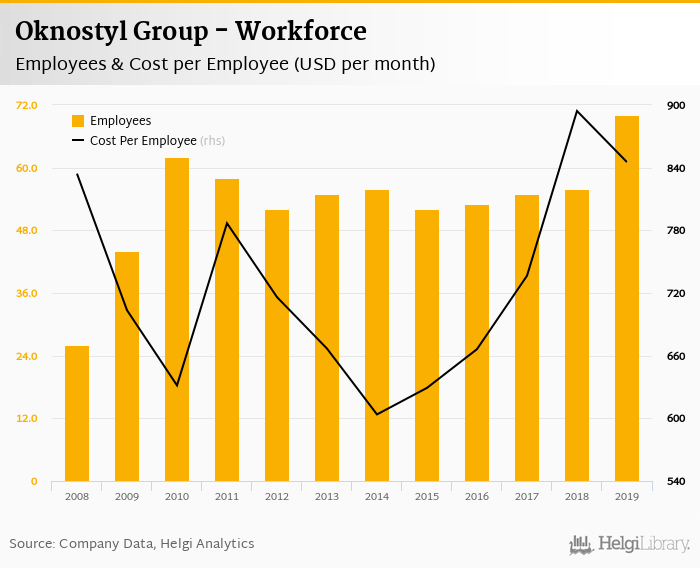 Oknostyl Group employed 70.0 employees in 2019, up 25% compared to the previous year. Historically, between 2008 and 2019, the firm's workforce hit a high of 70.0 employees in 2019 and a low of 26.0 employees in 2008.