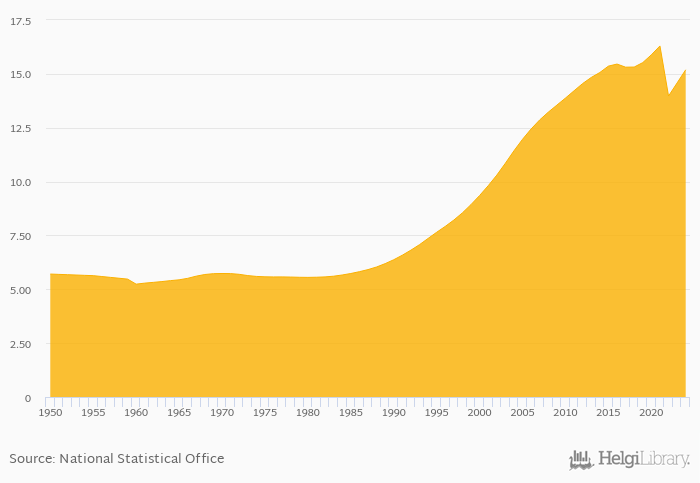 Historically, old age dependency ratio in Dem. People's Republic of Korea reached an all time high of 16.3% in 2021 and an all time low of 5.24% in 1960. When compared to Dem. People's Republic of Korea's main peers, old age dependency ratio in China amounted to 19.0%, 50.7% in Japan, 27.6% in South Korea and 14.2% in Vietnam in 2024.