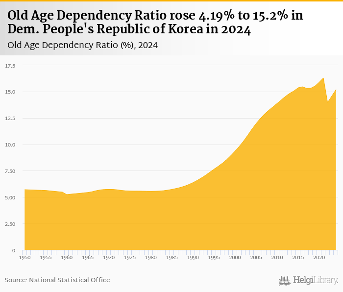 Old age dependency ratio rose 4.19% to 15.2% in Dem. People's Republic of Korea in 2024, according to the National Statistical Office.