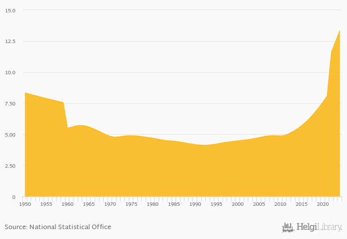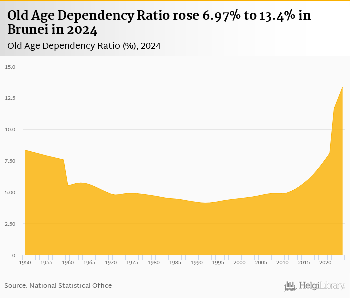 Old age dependency ratio rose 6.97% to 13.4% in Brunei in 2024, according to the National Statistical Office.