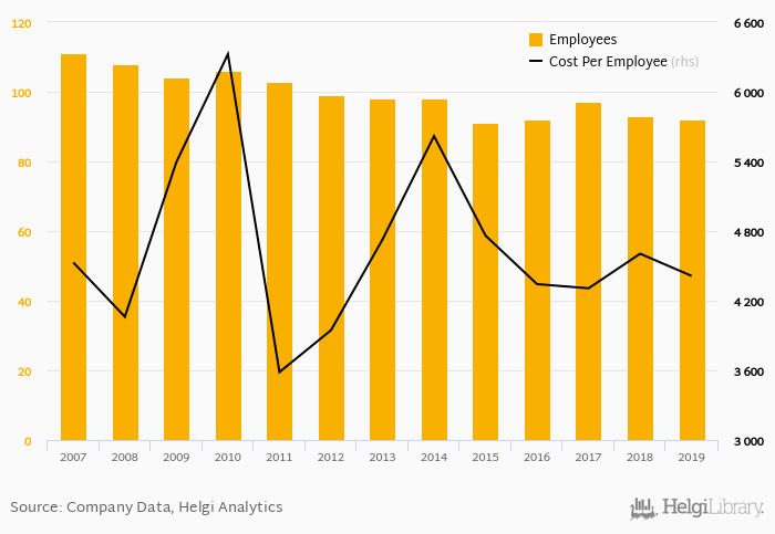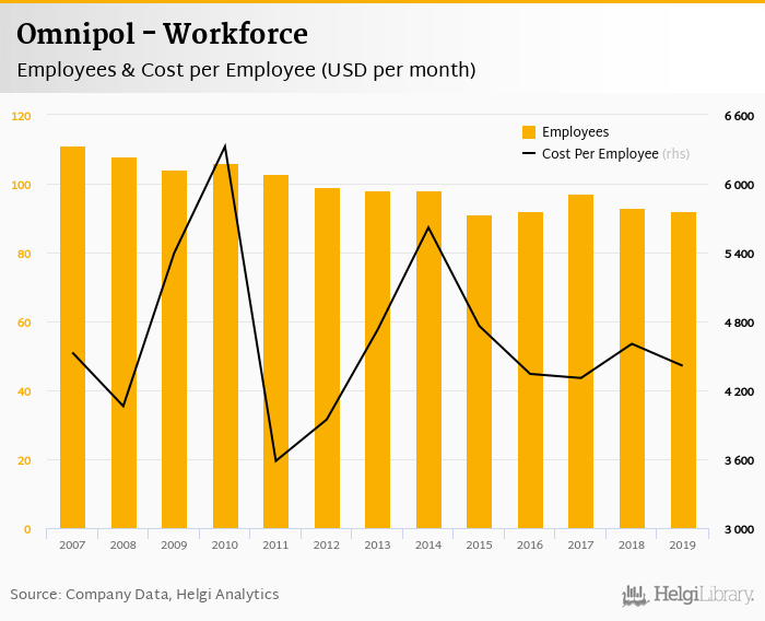 Omnipol employed 92.0 employees in 2019, down 1.08% compared to the previous year. Historically, between 2007 and 2019, the firm's workforce hit a high of 111 employees in 2007 and a low of 91.0 employees in 2015.