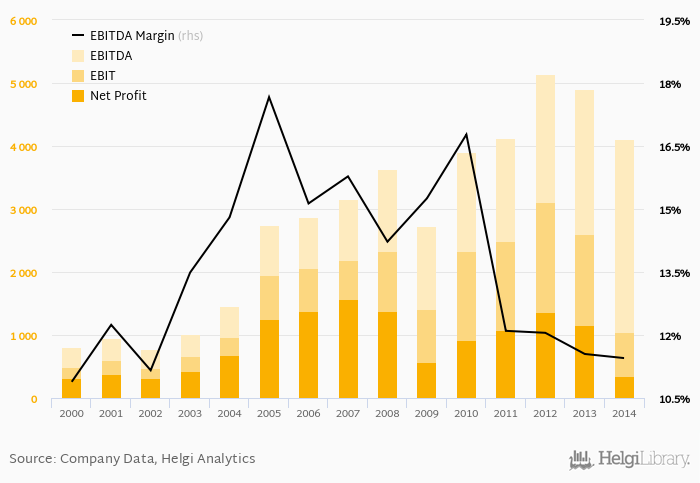 Historically, between 1998 - 2014, the firm’s net profit reached a high of EUR 1,579 mil in 2007 and a low of EUR 169 mil in 1998. Since 2009, the firm's net profit has decreased 37.6% or -9.00% a year on average.