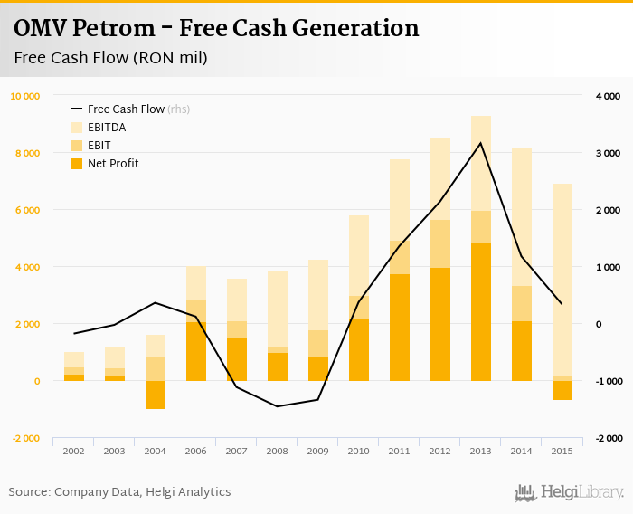 The company generated cash, defined by a sum of net profit and depreciation, of RON 6,085 mil or 33.5% of sales. When investments are excluded, free cash flow reached RON 329 mil, or 1.82% of sales in 2015.