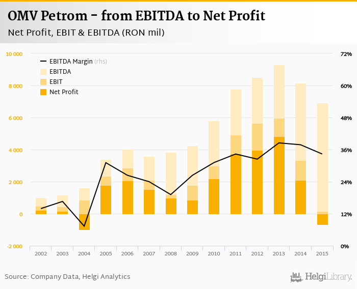 OMV Petrom made a net profit of RON -676 mil with revenues of RON 18,145 mil in 2015, down by 132% and down by 15.8%, respectively, compared to the previous year. This translates into a net margin of -3.73%.