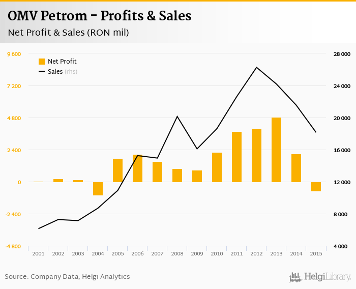 OMV Petrom made a net profit of RON -676 mil in 2015, down 132% compared to the previous year. Total sales reached RON 18,145 mil, which is down 15.8% when compared to the previous year.