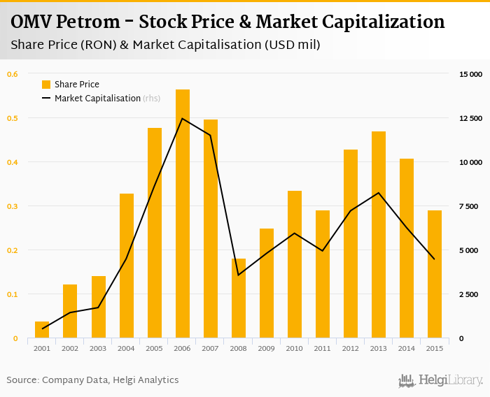 OMV Petrom stock traded at RON 0.290 per share at the end 2015 implying a market capitalization of USD 4,434 mil.