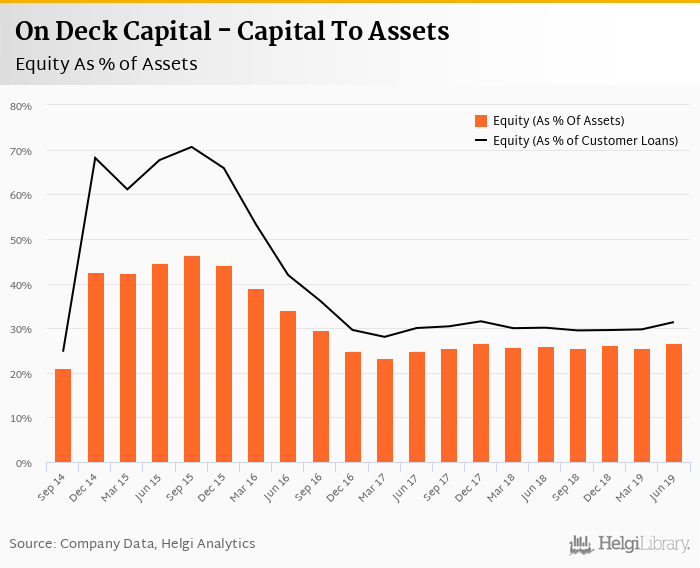 On Deck Capital's Equity reached 12.4% of total assets in the 2Q2019, up from 10.8% for the previous year. As a share of net customer loans, the ratio amounted to 32.3% at the end of the second quarter of 2019.