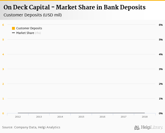 On Deck Capital accounted for 0% of all customer deposits taken by banks in USA at the end of 2018. Historically, the bank’s market share in customer deposits reached an all time high of 0% in 2018 and an all time low of 0% in 2012.