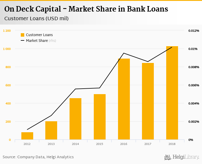 On Deck Capital accounted for 0.010% of all customer loans issued in USA at the end of 2018. Historically, the bank’s market share in customer loans reached an all time high of 0.010% in 2018 and an all time low of 0.001% in 2012.
