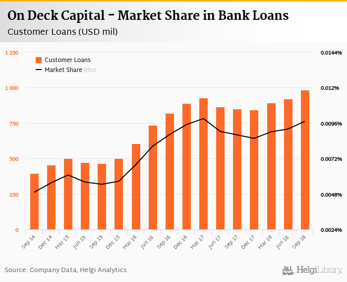 On Deck Capital accounted for 0.010% of all customer loans issued in USA at the end of 2018-09-30. Historically, the bank’s market share in customer loans reached an all time high of 0.010% in 2017-03-31 and an all time low of 0.005% in 2014-09-30.
