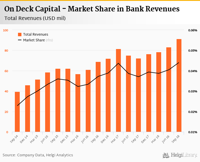 On Deck Capital generated total banking revenues of USD 91.3 mil in 2018-09-30, up 9.76% compared to the previous year.