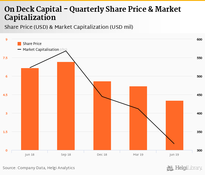 On Deck Capital stock traded at USD 4.01 per share at the end of second quarter of 2019 implying a market capitalization of USD 317 mil.