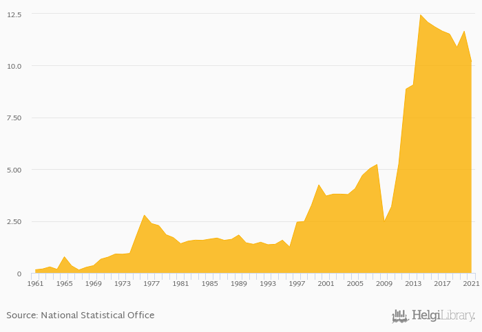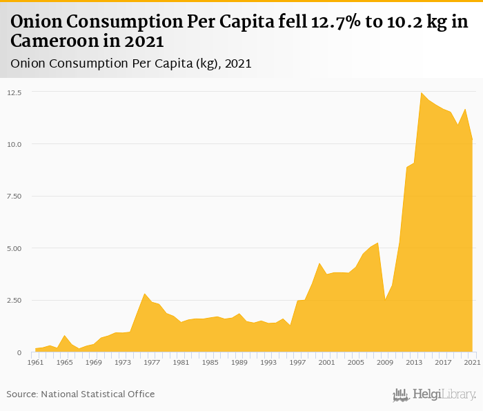 Onion consumption per capita fell 12.7% to 10.2 kg in Cameroon in 2021, according to Faostat.