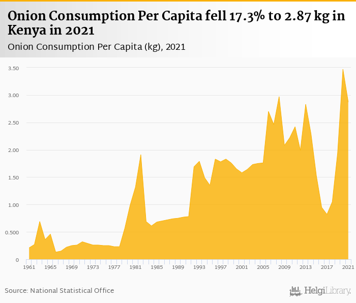 Onion consumption per capita fell 17.3% to 2.87 kg in Kenya in 2021, according to Faostat.