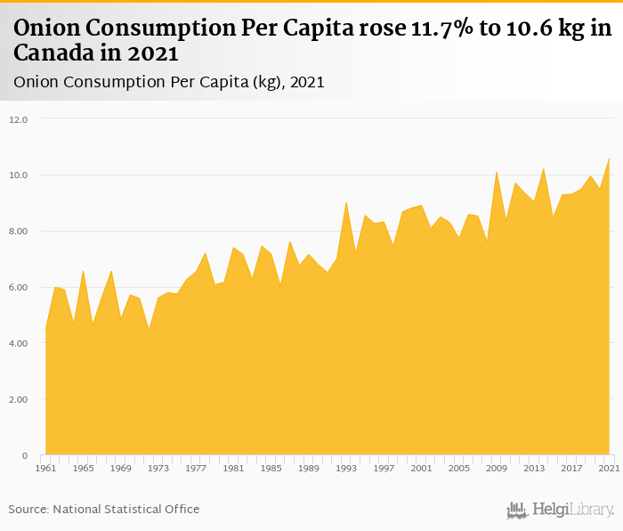 Onion consumption per capita rose 11.7% to 10.6 kg in Canada in 2021, according to Faostat.