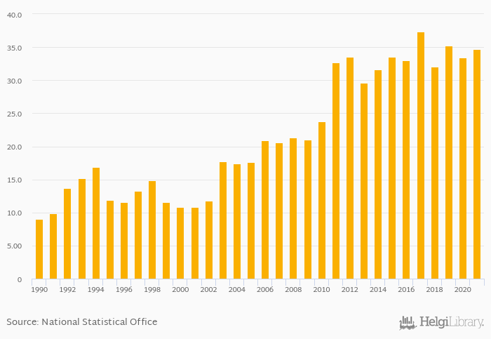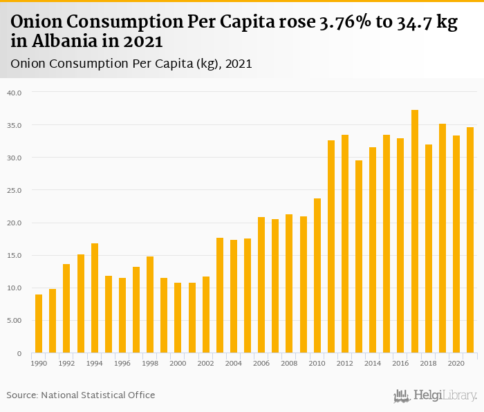 Onion consumption per capita rose 3.76% to 34.7 kg in Albania in 2021, according to Faostat.