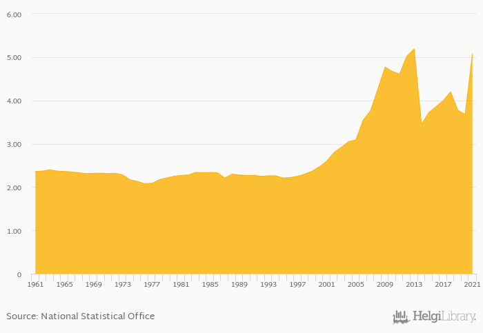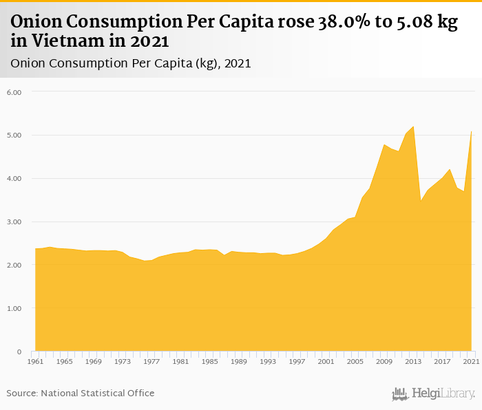 Onion consumption per capita rose 38.0% to 5.08 kg in Vietnam in 2021, according to Faostat.