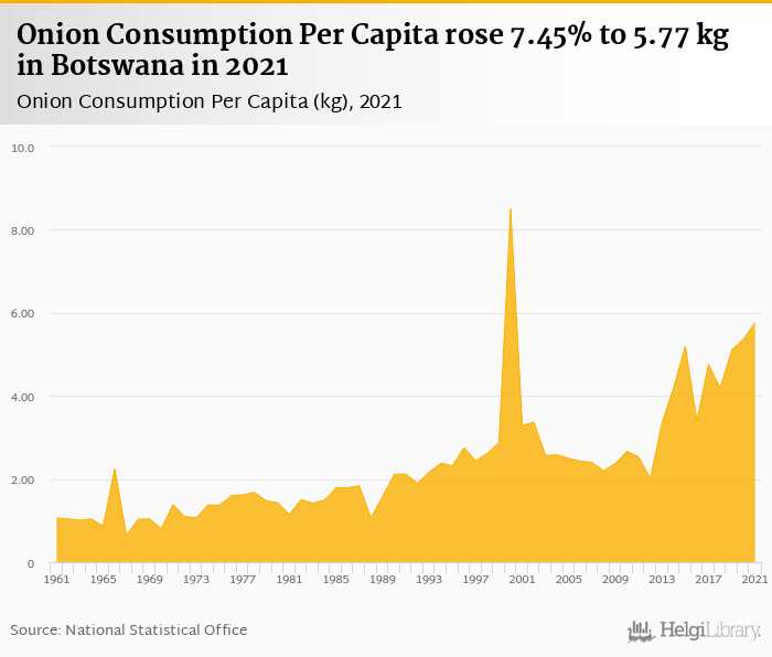 Onion consumption per capita rose 7.45% to 5.77 kg in Botswana in 2021, according to Faostat.