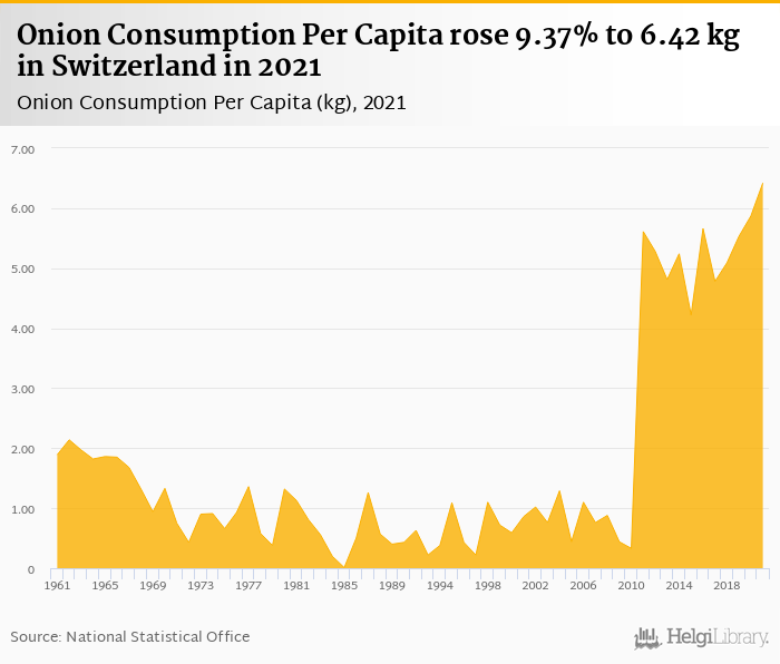 Onion consumption per capita rose 9.37% to 6.42 kg in Switzerland in 2021, according to Faostat.