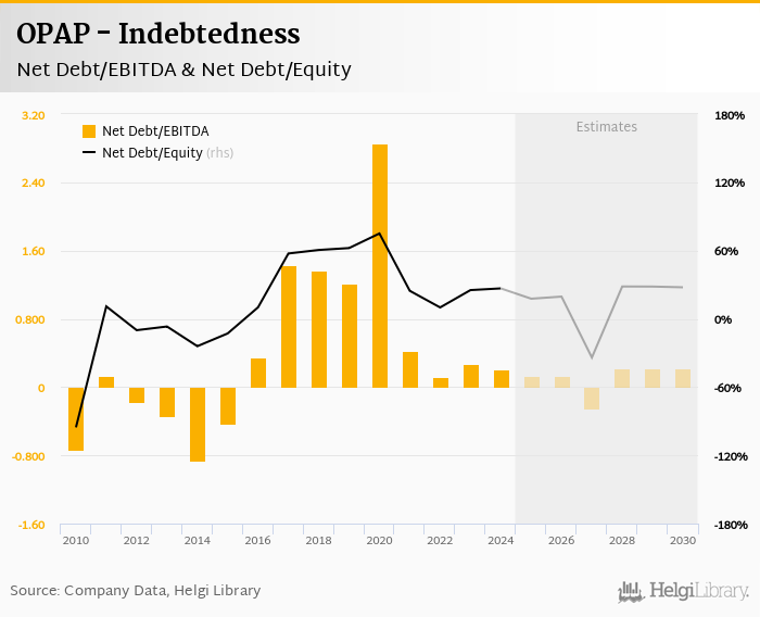 OPAP's net debt stood at EUR 165 mil and accounted for 26.7% of equity at the end of 2024. The ratio is up 1.48 pp compared to the previous year.