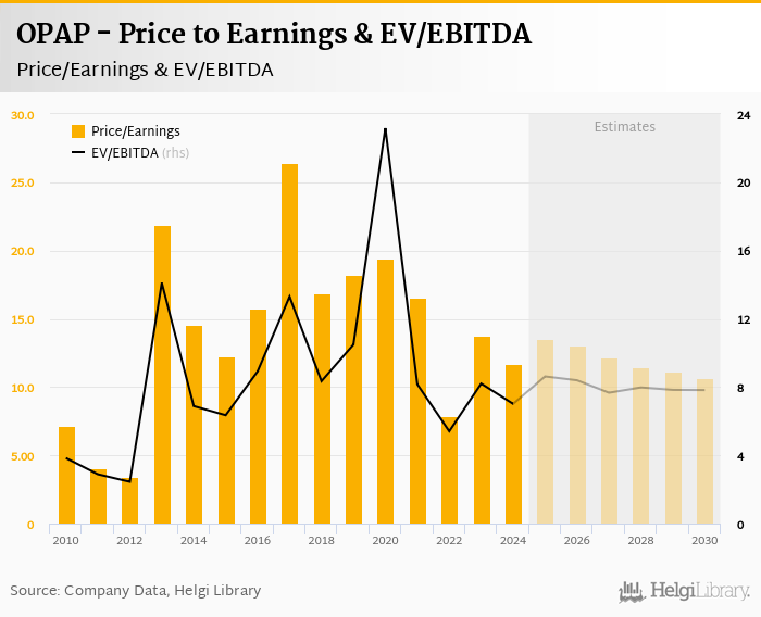 OPAP stock traded at EUR 15.7 per share at the end 2024 translating into a market capitalization of USD 5,896 mil.
