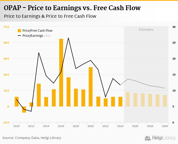 Regarding cash generated defined by the sum of net profit and depreciation, the stock traded at 9.12x at the end of 2024. When investments are excluded to get free cash flow, OPAP traded at 9.03x.