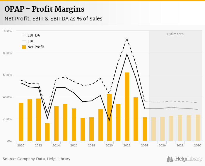 OPAP made a net profit of EUR 488 mil with revenues of EUR 2,246 mil in 2024, up by 19.6% and up by 118%, respectively, compared to the previous year.