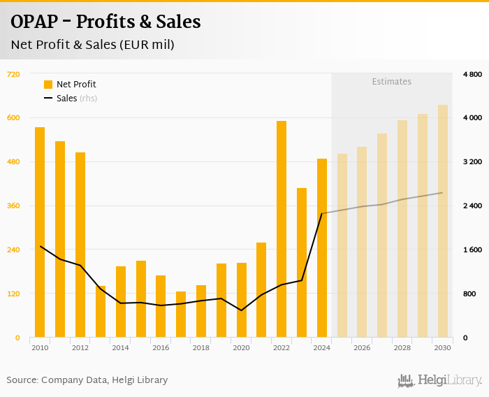 OPAP made a net profit of EUR 488 mil in 2024, up 19.6% compared to the previous year. Total sales reached EUR 2,246 mil, which is up 118% when compared to the previous year.